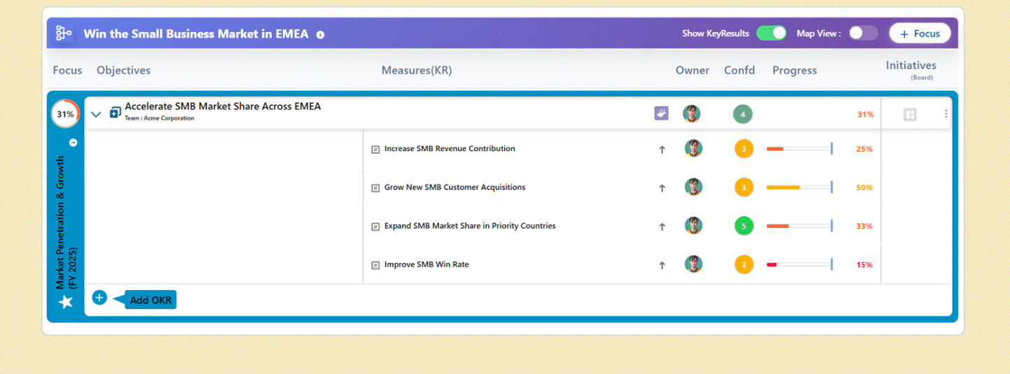 This structure allows you to visualize the relationship between objectives in the Map View, providing a clear picture of how each objective contributes to the overall focus area.
