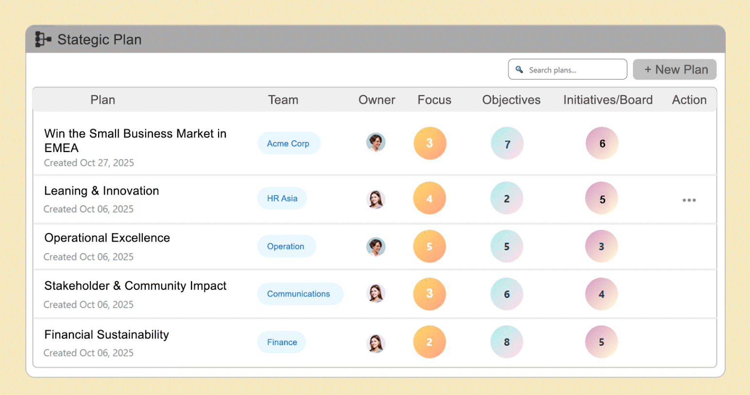 To create a new plan, click the + New Plan button at the top-right corner of the page.This will open the Create Strategic Plan window, where you can define your plan’s name, description, mission, team, owners, and access level.