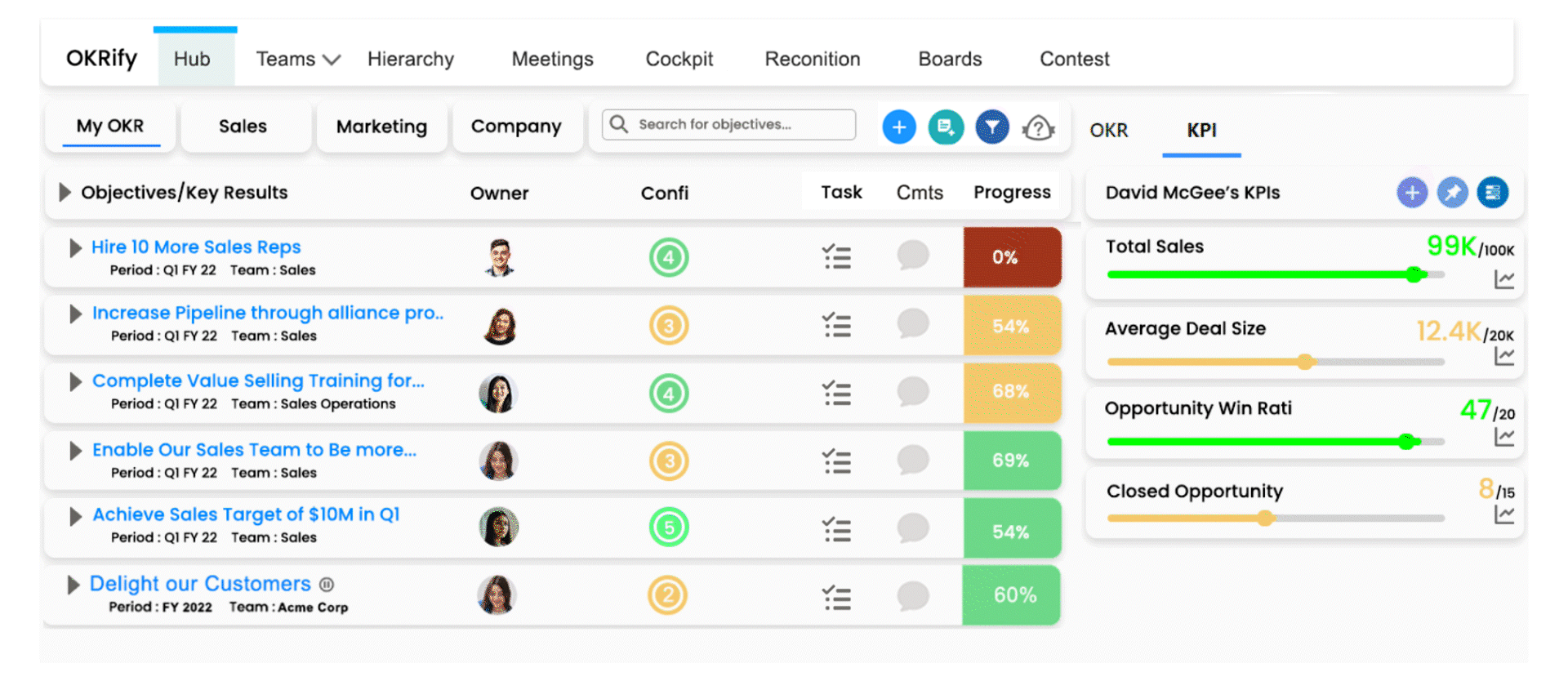 Hub has tabs for My OKR, Company and Tabs for user’s teams. In each tab, Objectives are displayed along with KPIs and OKR dashboard.