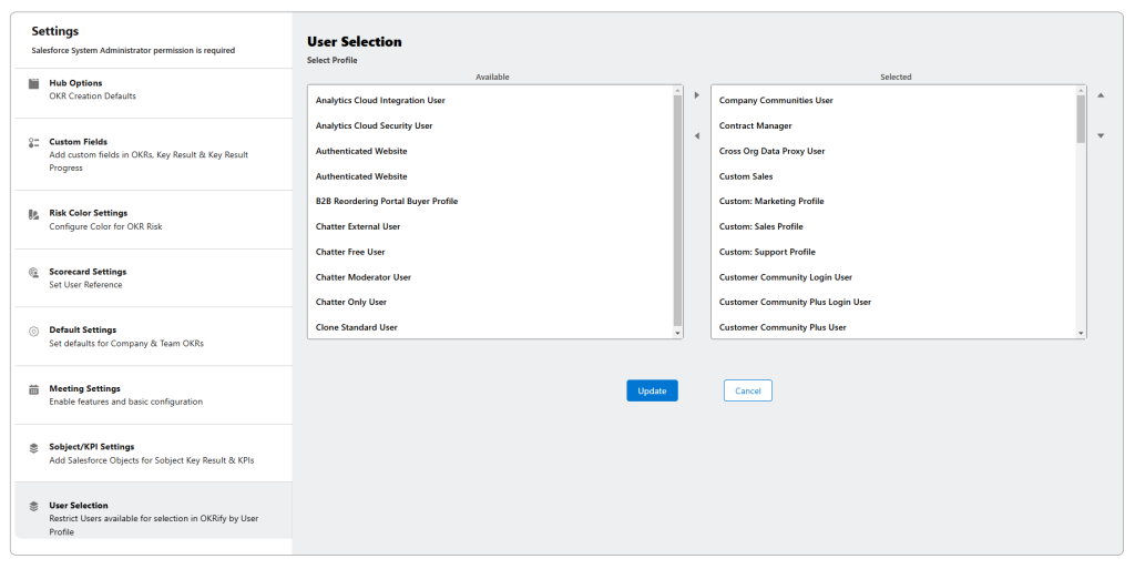 User Selection allows restricting the users that can be selected in the OKRify application based on Salesforce profiles. If no profile is selected, users of all profiles will be available for selections.