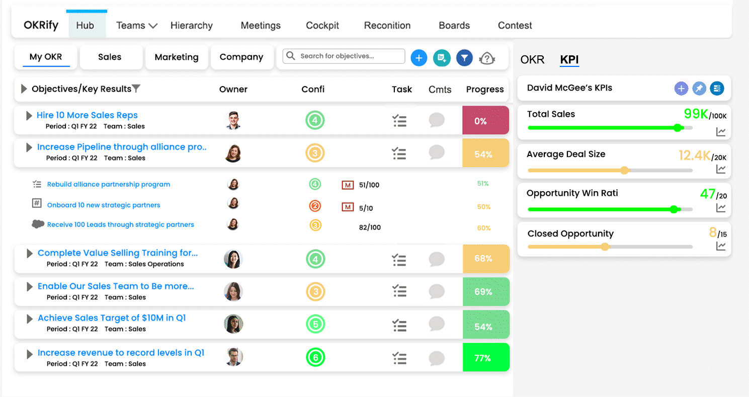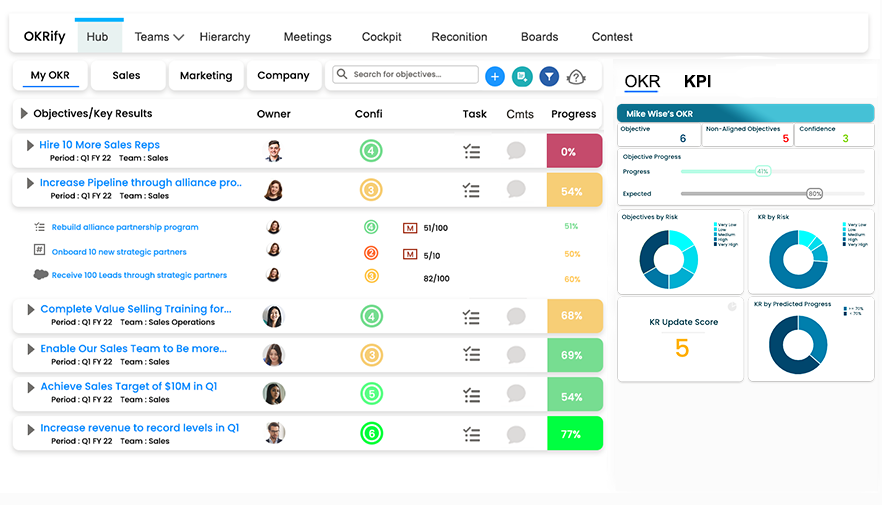 - KPI: Displays the user's KPIs. Users can create and add KPIs to My OKR to view key real-time metrics from Salesforce. (Prerequisite: KPI is enabled in OKRify Settings)